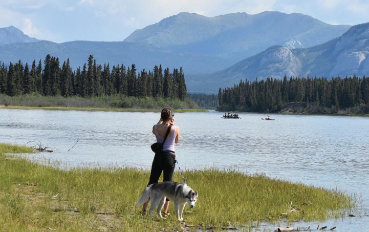 Left - Dyea Dippers pass Burma Road Landing about two hours after their start. Support crew member Lexi Korobkin and her dog, Kaiya, capture a photo. Kayaker (K1) Brad Pennington drafts the Dippers voyager canoe. Above - The Dyea Dippers after arriving in Carmacks.