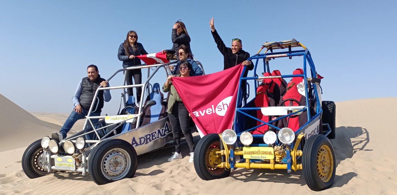 Por la tarde recorrimos las enormes dunas de arena del desierto en tubulares. Estos ligeros pero potentes automóviles de doble tracción son capaces de escalar pendientes de arena suelta y ofrecer una experiencia llena de adrenalina. El buggy sube a la cima a máxima velocidad, donde los valientes bajaránentablasdearena.