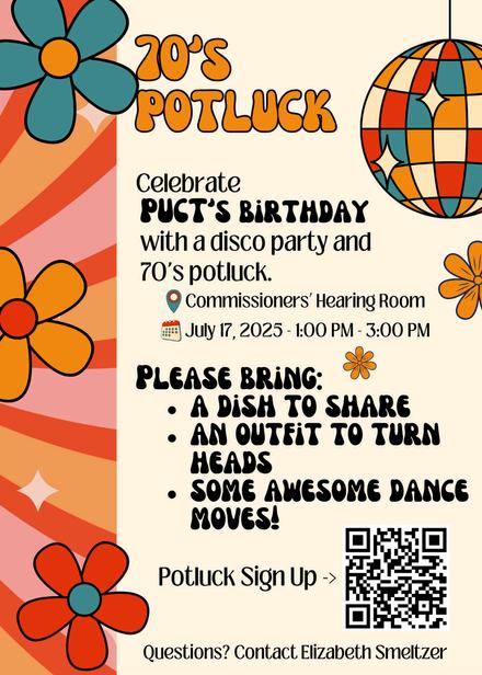 July 17 (1:00 p m – 3:00 p m , In-Person in the Commissioner’s Hearing Room): Join us on Thursday, July 17, for a potluck lunch to celebrate the PUCT’s 50 Birthday! Wear your craziest (work appropriate) 70s outfit and come ready to party! Sign up to bring food th