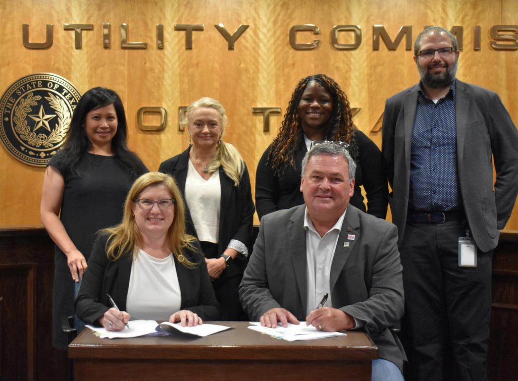 Representatives from the PUCT and KPUB gathered in the Commissioners Hearing Room on June 25 for a signing ceremony