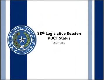 Con solo hacer clic con el mouse, los tejanos ahora pueden seguir el progreso de la PUCT en la implementación de legislación importante que impacta la regulación de las industrias de electricidad, agua y telecomunicaciones en Texas. La agencia dio a conocer un nuevo Rastreador Legislativo esta primavera para resumir nuestro progreso en la promulgación de requisitos legales y al mismo tiempo crear una mayor transparencia para el público.