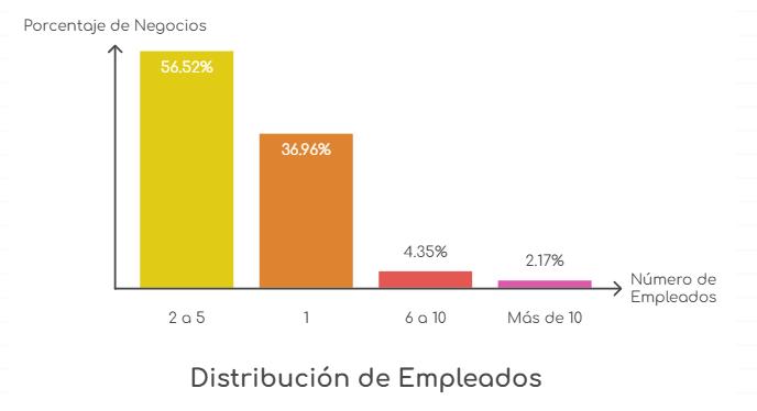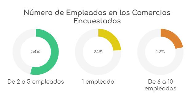 En cuanto al número de empleados, el 54% de los comercios encuestados respondieron tener de 2 a 5 colaboradores, un 24% tiene solo 1 empleado y un 22% reportaron tener de 6 a 10 trabajadores. De acuerdo a lo anterior, los establecimientos encuestados son catalogados como microempresas pues ninguno de ellos supera los 10 empleados.