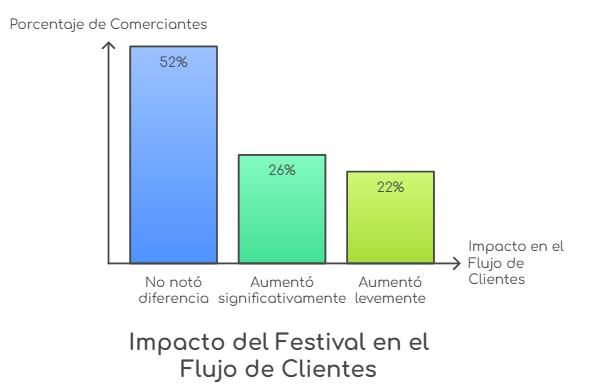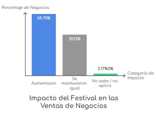 De los establecimientos que reportaron aumento en sus ventas durante los días de festival, el 30,43% han tenido un impacto positivo, donde sus ventas aumentaron entre un 11 a un 30%; un 26,09% de comercios dijeron haber aumentado entre un cero a un 10% y un 2,17% reportaron entre un 31 y un 50%.