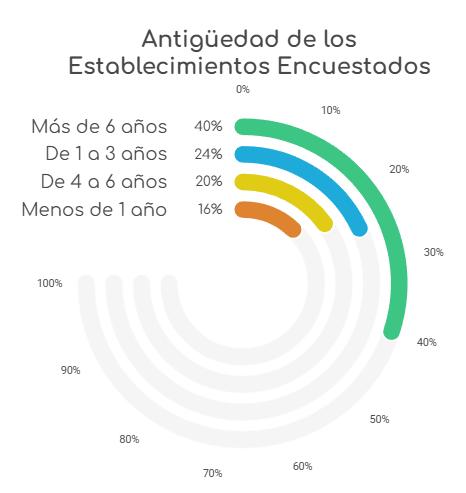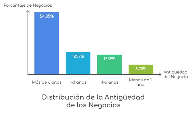 Respecto a su antigüedad, se evidencia una presencia significativa de negocios consolidados: el 54,35% de los establecimientos tiene más de seis años de funcionamiento. Por su parte, el 19,57% corresponde a negocios entre 1 y 3 años de operación, el 17,39% lleva entre 4 y 6 años, y el 8,70% corresponde a emprendimientos recientes, con menos de un año desde su apertura.
