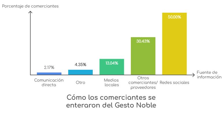 Los medios por los cuales los comerciantes se enteraron de la realización de El Gesto Noble fueron los siguientes: un 50% dijo que se enteró por medio de las redes sociales del Instituto de Cultura y de la Alcaldía, un 30,43% respondió que se enteró gracias a otros comerciantes o proveedores; por su parte, un 13,04% de comerciantes respondió medios locales (radio, prensa), un 4,35% se enteró por personas que visitaron su local comercial y un 2,17% se enteró por comunicación directa de la organización (correo, llamada).