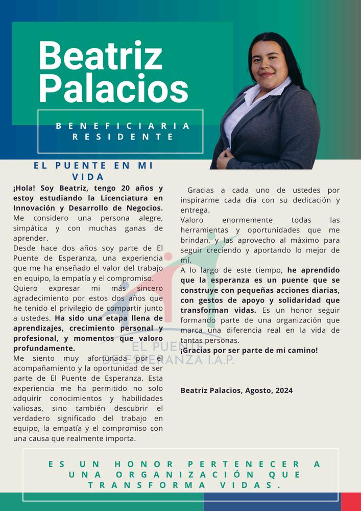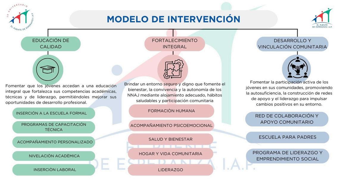Somos una organización que rompe verdaderamente el ciclo de pobreza generando bienestar a través de educación. El Puente de Esperanza I.A.P. es una Institución de Asistencia Privada para adolescentes entre los 14 y 24 años preferentemente originarios de zonas rurales e indígenas del estado de Querétaro. De estrato socioeconómico: Pobreza extrema o escasos recursos y en situación de vulnerabilidad.