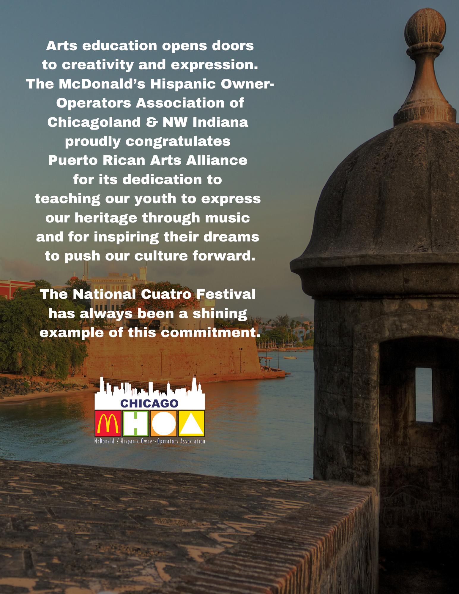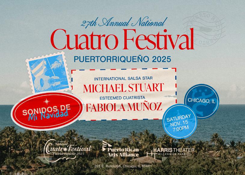 Con gran alegría les damos la bienvenida al 27.º Festival Nacional del Cuatro, una celebración de nuestra música, cultura y orgullo puertorriqueño, presentada por el Puerto Rican Arts Alliance (PRAA) en el Teatro Harris de Chicago. PRAA está profundamente agradecida por su apoyo al Festival del Cuatro, el cual nos permite financiar diversos programas y eventos comunitarios durante todo el año. Su apoyo y donaciones ayudan a que PRAA ofrezca programas que enseñan a nuestros estudiantes la herencia, cultura y tradiciones puertorriqueñas a través de las artes.