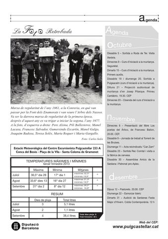 octubre Dissabte 5 – Sortida a Roda de Ter. Visita literària. Dimecres 9 – Curs d’iniciació a la muntanya. Seguretat. Dimarts 15 – Curs d’iniciació a la muntanya. Primers auxilis. Dissabte 19 i diumenge 20. Sortida a Puigsacalm (curs d’iniciació a la muntanya). Dilluns 21 – Projecció audiovisual de muntanya d’en Josep Pitarque. Pirineu Cantàbric. 19.30. CEP Dimecres 23 – Cloenda del curs d’iniciació a la muntanya.