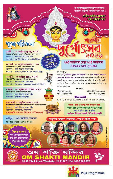 October 11 to 15 2021 Sarbojanin Puja Udjapan Porisod USA, Inc. Divya Dham Mandir 34-63 56th St, woodside, Queens, NY 11377.