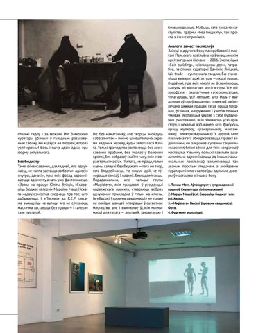 Аналогія замест пасляслоўя Зайсці з другога боку паспрабавалі і мас такі Польскага павільёна на Венецыянскім архітэктурным біенале — 2016. Экспазіцыя «Fair building», «кірмашовы дом», патра буе, па словах куратаркі Дамінікі Яніцкай, fair trade — сумленнага гандлю. Ёю стано віцца выварат архітэктуры — людзі працы, будаўнікі, пра якіх ніколі не ўспамінаюць, кажучы аб вартасцях архітэктуры. Усе фі ласофскія і экалагічныя суперканцэпцыі, узнагароды, усё лепшае, што ёсць у вы датных аўтараў выдатных праектаў, забяс печана цяжкай працай. Гэтая праца бруд ная, фізічная, напружаная і ў небяспечных умовах. Экспазіцыя ўяўляе з сябе будаўні чыя рыштаванні, якія займаюць усю пра стору, і некалькі вэб-камер, што фіксуюць працу муляроў, кранаўшчыкоў, мантаж нікаў, электразваршчыкаў. У другой зале павільёна гэта абмяркоўваецца. Праект ві довішчны, ён закранае сур’ёзны сацыяль ны аспект, блізкі сёння для ўсіх напрамкаў мастацтва. У выніку польскі павільён аша ламляльна адрозніваецца ад іншых нацы янальных павільёнаў, запамінаецца так званым простым гледачам, а знойдзены куратарамі ключ сапраўды адмыкае дзве ры ў мастацтва з іншага боку. 1. Томаш Мруз. Аўтапартрэт у суправаджэнні пацукоў. Скульптура, сілікон у скрыні. 2. Марцін Мацеёўскі. Скараціць бюджэт гале рэі. Акрыл. 3. «Magisters». Высокі ўзровень свядомасці. Фота. 4. Фрагмент экспазіцыі.