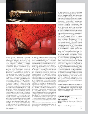 тычная праблема, — заўсёды зручны спосаб абысці вострыя куты ў гутар цы пра нацыянальную ідэнтычнасць. Аднак гэта ўсё ж добрая магчымасць даказаць, што нацыі існуюць у эпоху, калі глабальная інтэграцыя аслабляе суверэнітэт некаторых эканамічна больш слабых краін (тут варта нага даць пра сённяшні стан Грэцыі). Як адзначаў англійскі даследчык Бене дыкт Андэрсан, калі Савецкі Саюз разваліўся, здавалася, што скончыла ся ўся гісторыя і «з пачаткам новага тысячагоддзя нічога не застанецца ад Саюза Савецкіх Сацыялістычных Рэс публік, акрамя… рэспублік». Андэр сан да даў но выя час ткі да сва ёй знакамітай кнігі пра вытокі нацыяна лізму «Уяўныя супольнасці», упер шыню апублікаванай у 1983-м, калі югаслаўская вайна 1991—2001 гадоў толькі выспявала і ўсё больш і больш этнічных меншасцяў на тэрыторыях былой Югаславіі і СССР патрабава лі незалежнасці. Словы Андэрсана ўсё яшчэ гучаць актуальна. Аднак зда ецца, што свет знаходзіцца там, дзе ён быў сто гадоў таму, калі Першая сусветная вайна сфармавала сучас ную палітычную геаграфію, красамоў на адлюстраваную ў размяшчэнні на цыянальных павільёнаў у Джардзіні. З 90-х гадоў мінулага стагоддзя новыя нацыянальныя павільёны рассыпа юцца вакол Венецыі следам за амаль штогадовым абвяшчэннем Арганіза цыяй аб’яднаных нацый новых дзяр жаў. Пры наяўнасці павільёнаў Сірыі і Ірака і прымаючы да ўвагі ўручэнне спецыяльнай узнагароды Біенале пад польнаму сірыйскаму кінематаграфіч наму калектыву «Abounaddara», мы можам меркаваць, што чым больш войнаў і крызісаў перажывае свет, тым больш нацыянальных рэпрэзен тацый аказваецца ў фокусе міжнарод най аўдыторыі. Цалкам эсэ Вольгі Капёнкінай «Устойлі выя нацыі. Нацыянальныя павільёны на 56-м Венецыянскім біенале ў эпоху стро гай эканоміі, крызісу і войн» даступна на сайце www.artmargins.com.