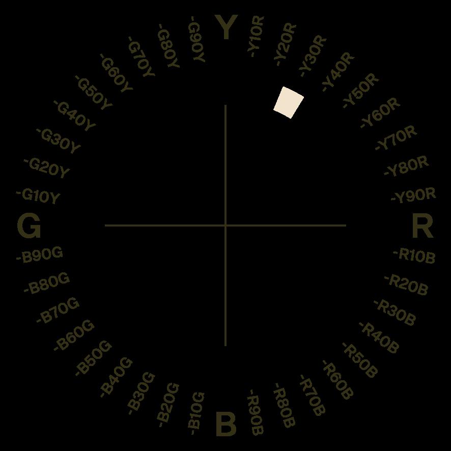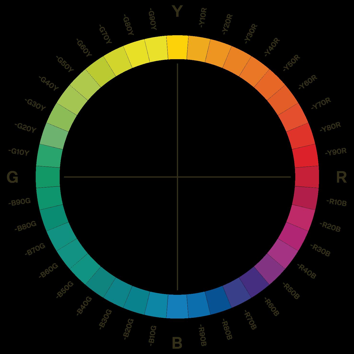 Den andre halvdelen av fargekoden, det bak bindestreken, består av tall og bokstaver. De sier noe om kulørtonen, altså hvilken farge det er. Fargene NCS-systemet bruker heter Y (gul), R (rød), B (blå) og G (grønn). Hvis du har en farge som heter R30B, betyr R-en at det er en rød farge, og 30B betyr at den har 30 prosent blått i seg.