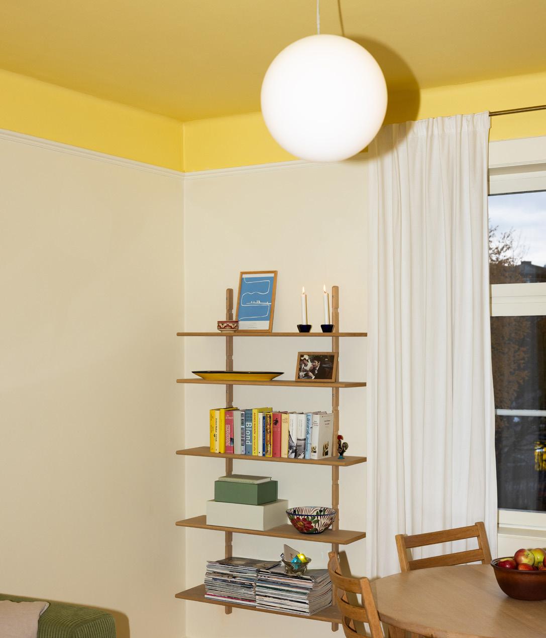 – En gledelig overraskelse har vært spillet i ettermiddagslyset fra trærne på utsiden. Fargen reflekterer masse lys og skaper et lett og rolig rom. Noe av det fineste i leiligheten til Mari er siktlinjen fra stuen, med de lyse turkise veggene mot den tydelige takbjelken, de grønne hyllene, de beige hyllene og det blå dempede toalettet.