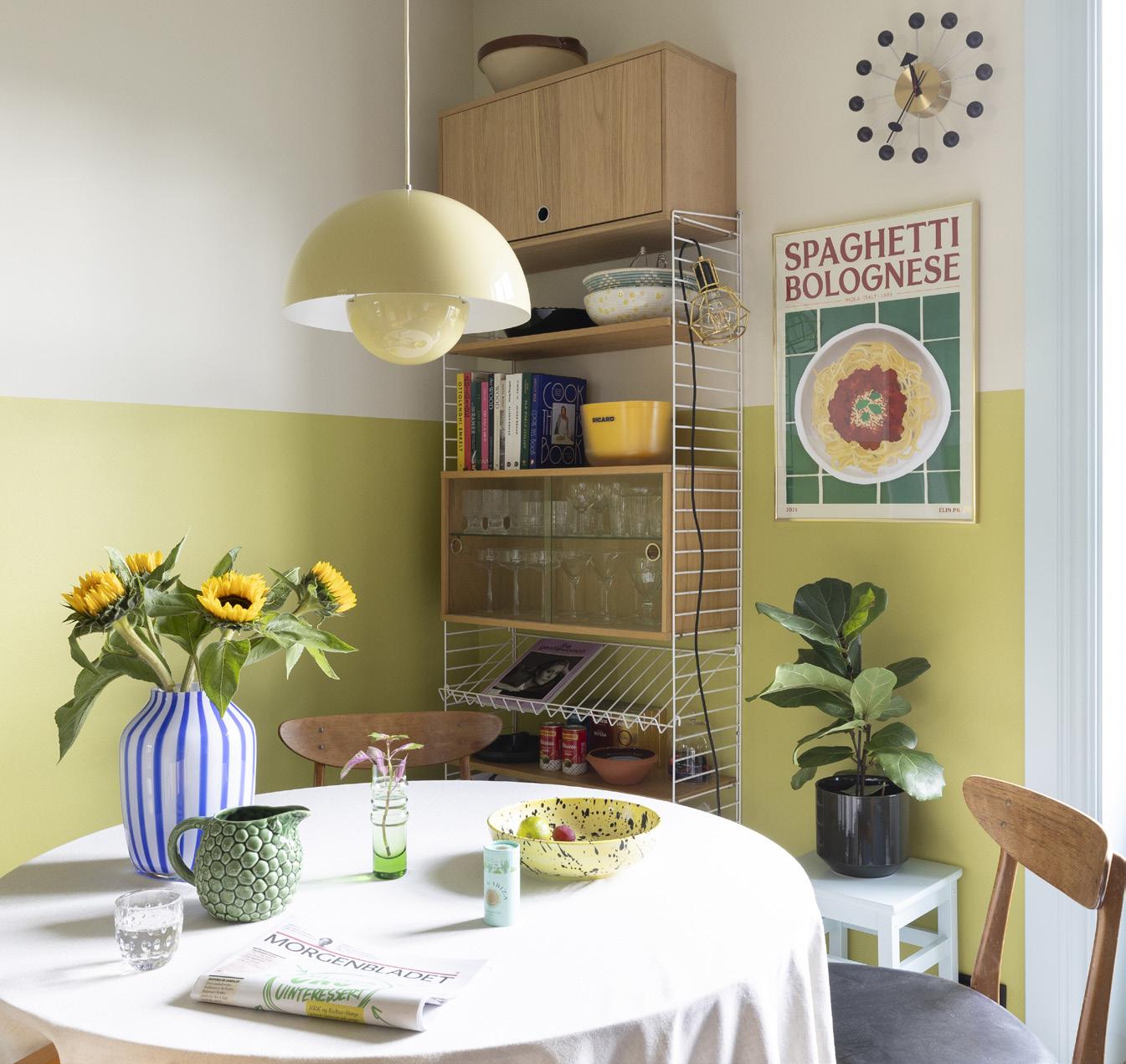 Noen av dem jeg fargesetter for, er opptatt av å se alle valgmuligheter og være med på fargevalget ned til den minste nyansen. Mari hadde ikke det behovet. Hun pekte ut noen grønne, oransje, blå og turkise farger, og det ble grunnlaget for paletten. Hun hadde også hatt en lys mintfarget nyanse i den gamle leiligheten sin som hun elsket, og denne ville hun gjerne ha med videre. Problemet var bare at fargen ikke hadde en standardisert kode, og de to leilighetene var veldig ulike når det gjaldt dagslys. Jobben min ble derfor å finne en farge som ga omtrent den samme følelsen i rommet.