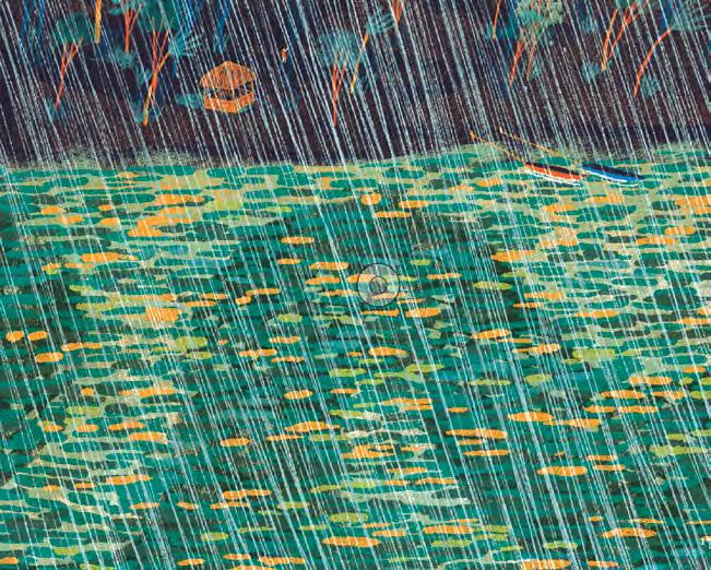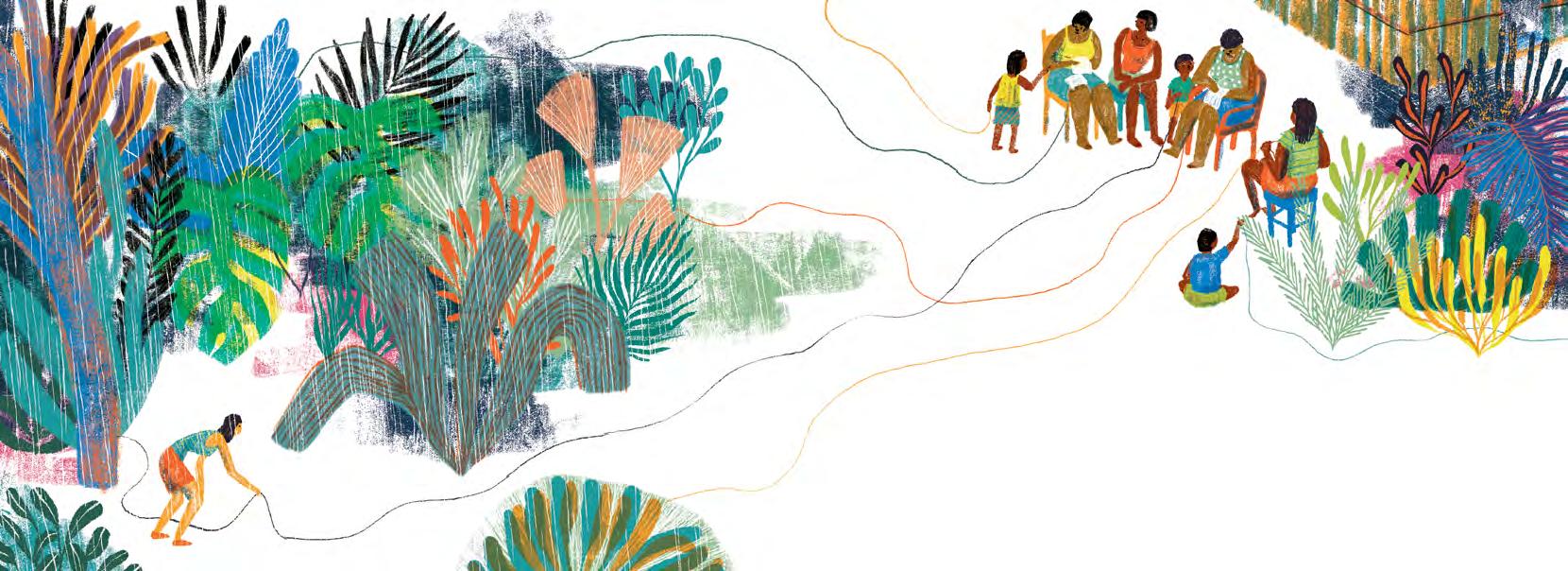 Após explorar a capa, o professor pode mostrar as páginas que antecedem a história propriamente dita, como a página de rosto e a primeira ilustração. É interessante que a criança note que essa imagem já remete o leitor à história, conduzindo-o para dentro da floresta, antes mesmo de a história começar. A multiplicidade de cores, as formas das folhas das árvores e da vegetação, os caules e a chuva são elementos que podem ser explorados. Já na página de rosto, os fios que bordadeiras e crianças carregam trazem a ideia de que a história se prolonga para além do livro.