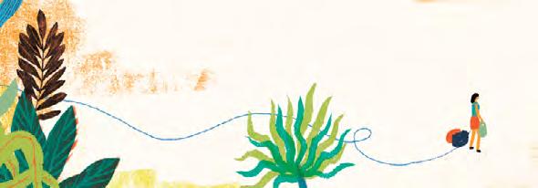 Um exemplo é a imagem de página dupla que mostra o caminho da professora da cidade onde ela vivia até o rio que a levará floresta adentro.