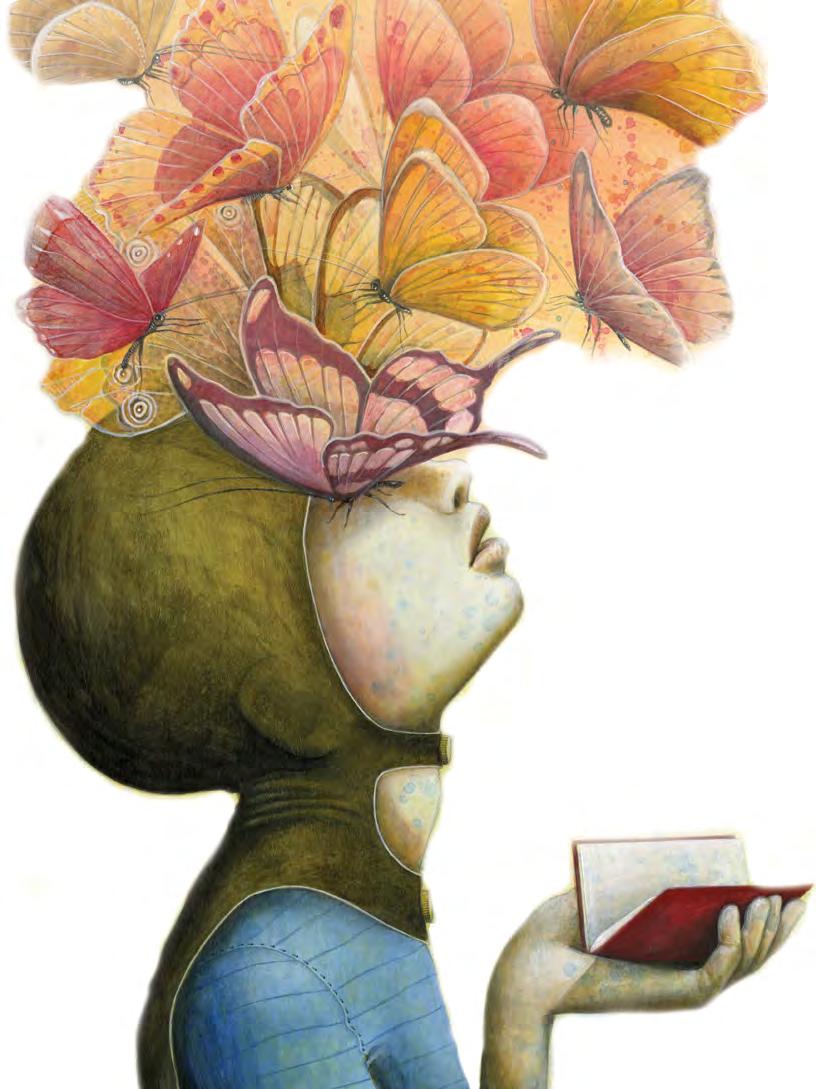 Em relação à possibilidade de a obra também ser lida como uma narrativa poética, a partir do conjunto de poemas e ilustrações, destaca-se o fato de que o personagem, logo nas primeiras páginas, encontra um livro vermelho, objeto presente em todas as ilustrações nas mãos dos poetas em estado de infância. Aqui cabe ressaltar com Bachelard (1988, p.111) o que esse estado de infância diz de uma “infância imóvel”, sem devir, e “liberta da engrenagem do calendário”. Não se trata, portanto, de pensarmos os poetas homenageados sendo crianças como categoria geracional, mas de pensá-los na perspectiva do maravilhamento pelas coisas do mundo (e pelos livros do mundo!), algo que, para o filósofo Bachelard, pode durar a vida toda. Nesse sentido, pode-se dizer que a infância é a grande personagem do livro de André Neves.