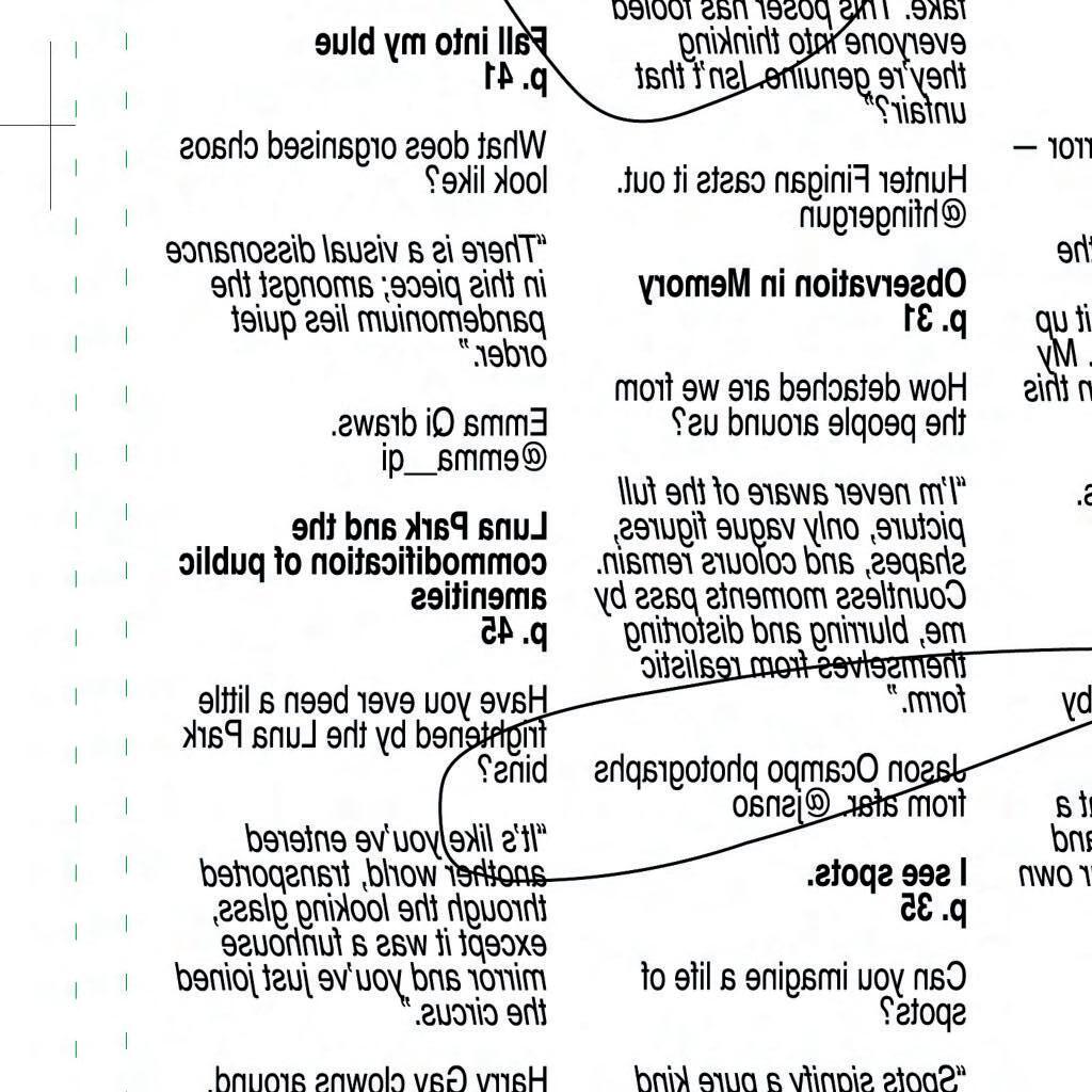 Neon Webs pg. 1 — mention of suicide. Have you seen the Bangkok aquarium? pg. 9 — depictions of derealisation. Handpicked pg. 17 — depictions of self-harm and body dysmorphia. Play The Game pg. 21 — depictions of blood, gore, weapons and firearms.