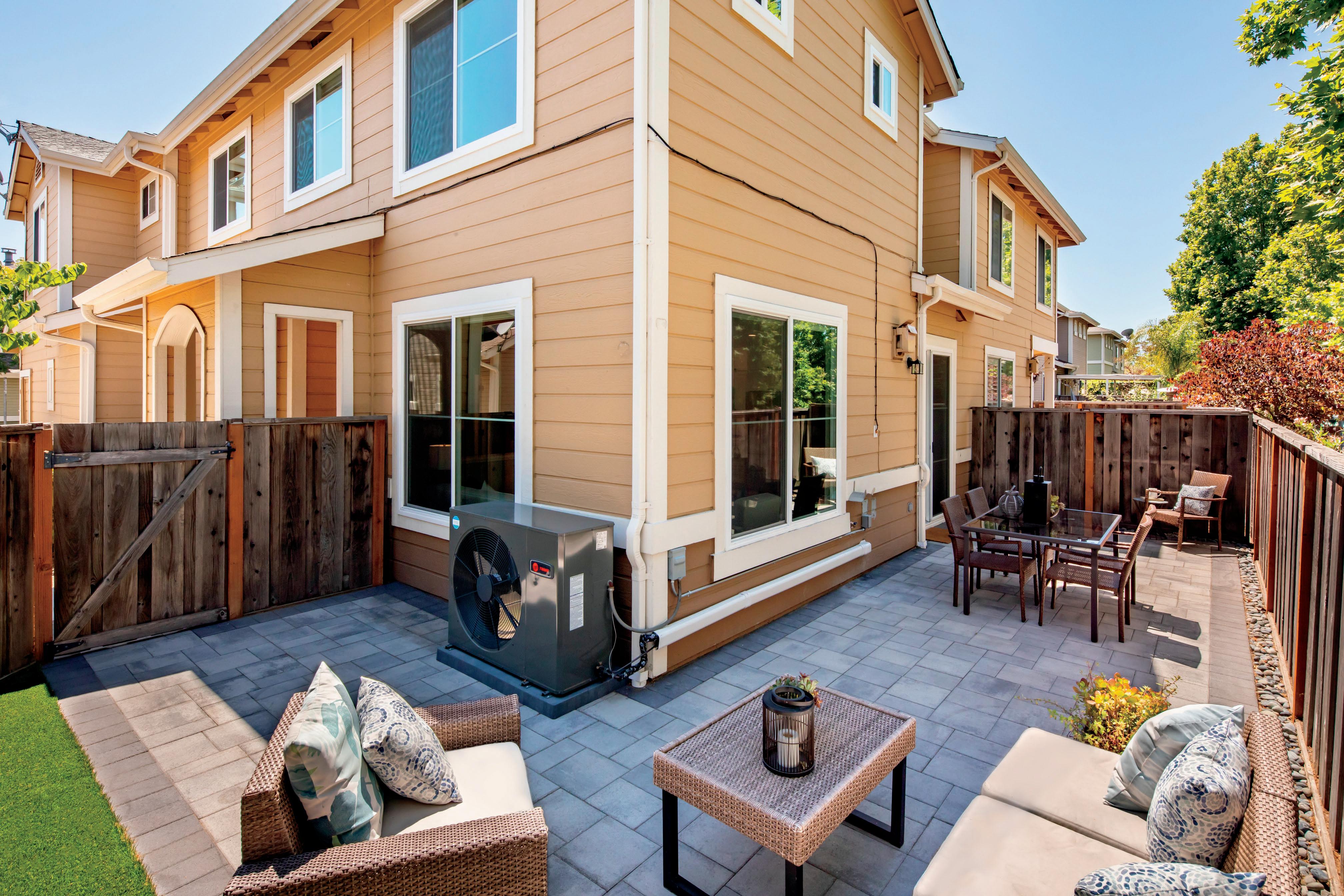 Step into the tranquil oasis of the backyard, a haven of serenity and privacy. The meticulously crafted pavers create a stylish and low-maintenance space, while the lush drought tolerant faux grass adds a touch of vibrancy Surrounded by gracefully swaying trees, immerse yourself in nature's embrace and relish in the peaceful ambiance. Whether for relaxation or entertainment, this inviting backyard offers a sanctuary where you can unwind and enjoy the beauty of your surroundings.