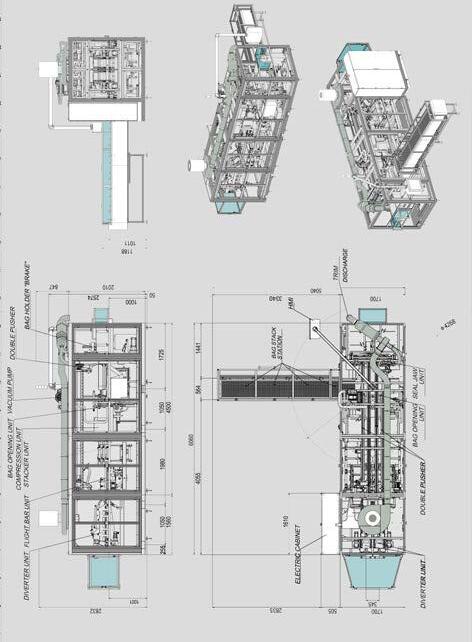 • Bag opening unit with pneumatic blower, vacuum gripping arms and product introduction levers. Bag bottom layer support station with telescopic drawer; the loading is manual and requires machine shutdown.