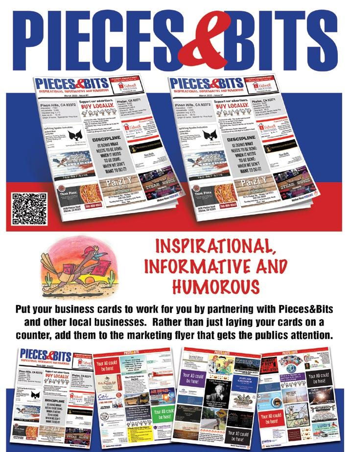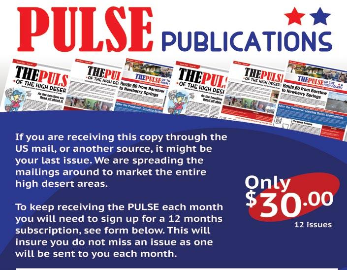 May 2024 - Issue #27 PRSRT STD U.S. POSTAGE PAID Victorville, CA PERMIT #187 PULSE PUBLICATIONS P O Box 290066, Phelan, CA 92329-0066 *************ECRWSSEDDM***** POSTAL CUSTOMER Check out the events going on in our area this month. SENIORS, VETERANS, FAMILIES, COMMUNITIES Stories inside PULSE PUBLICATIONS Use the QR-Code to find us online. Big Bear Valley Historical Museum: A Tale of Two Cities Gem Hunting in CALICO