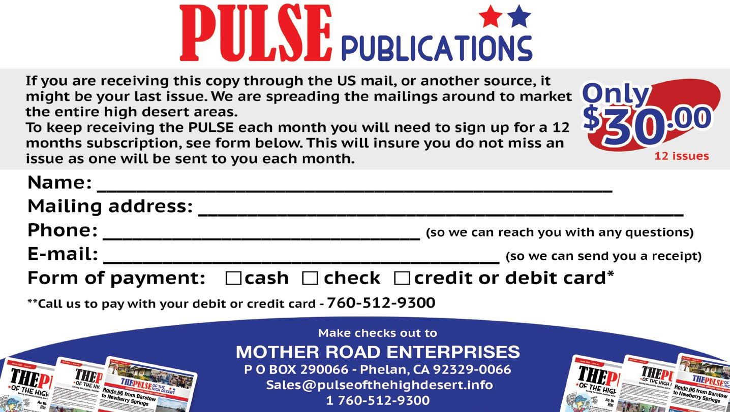 The TEAM here at PULSE Publications thank you for your support. Using and/or letting our advertisers know you enjoy the PULSE insures our continuing to publish the newspaper.
