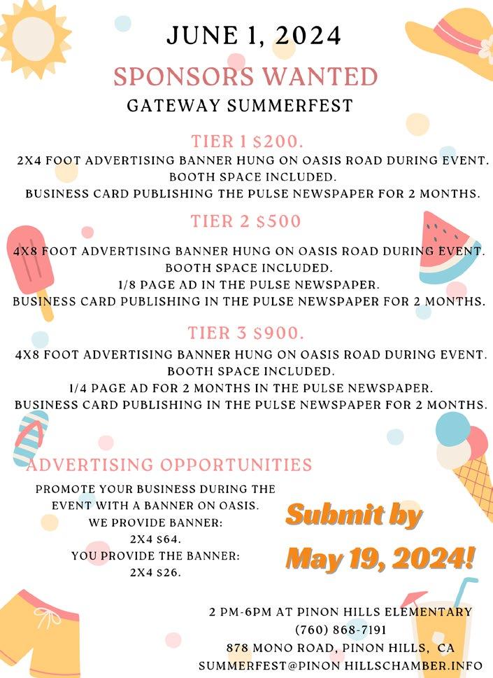 The festival will include an artisan market, music, food vendors, a kid’s zone, raffles, and more. The outdoor event is scheduled from 2 to 6 p.m. on June 1st at Piñon Hills Elementary School, 878 Mono Road.