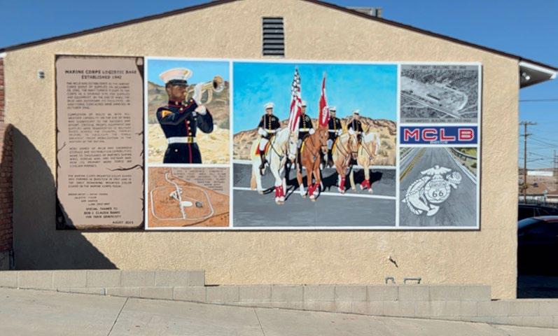IWAS RECENTLy h ONORED to have been invited to the dedication ceremony for the latest mural created by Main Street Murals. This mural represents the Marine Corps Logistics Base Barstow. Established in 1942, it has been an important part of our local history. The base is a major employment source as most workers are civilians. Aside from the huge economic impact, we can take pride in knowing the only Marine Corps Mounted Color Guard is based there.