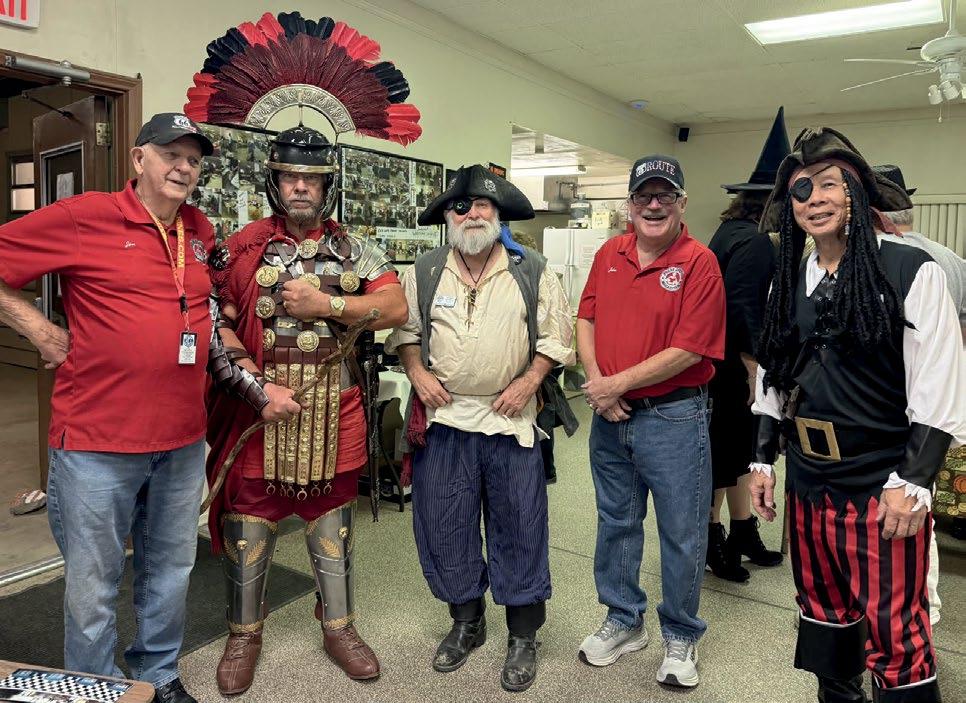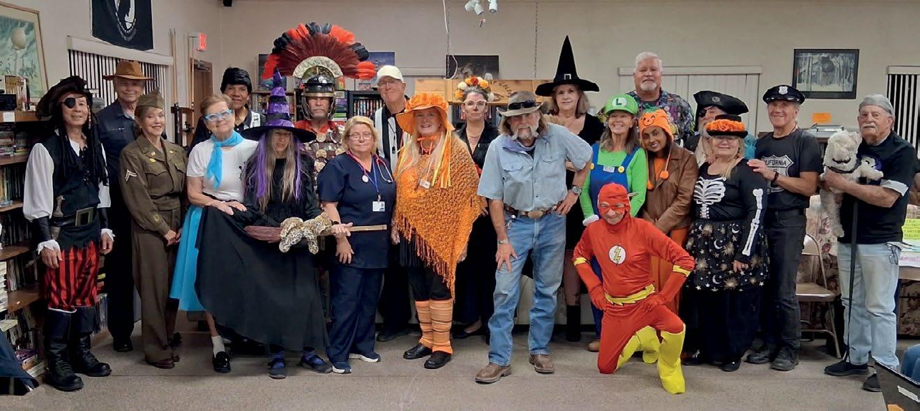 their spirit by arriving all decked out in interesting and creative costumes, ranging from an ancient Roman in armor, to witches, pirates, cowboys, and a 1950's era couple ready to jitterbug. Loaner hats and custom made Halloween cookies added to the fun.