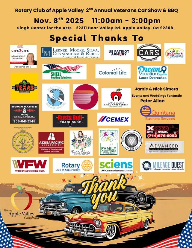 C LUB hosted an outstanding event honoring our United States Military members, on November 8, 2025, the Saturday before Veterans Day. The Singh Center for the Arts in Apple Valley was packed both inside and out with people attending the Veteran's Car Show and Resource Fair. Early in the morning sparkling antique and vintage vehicles, food trucks, and organizations setting up booths pulled into the parking area, while many Veteran's support groups set up tables inside the main lobby.