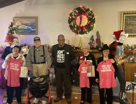 Next up- Our interesting and active 90-somethings. The action begains with Board Member Mike Phillips revealing his official "Don't Mess With the Nonagenarian" t-shirt, hidden under his suitcoat. His role is making sure all three deserving ladies, Clara Petrosky, Bonnie Ingram, and Lorraine Moffat, each get their own official pretty-in-pink Nonagenarian T. Although