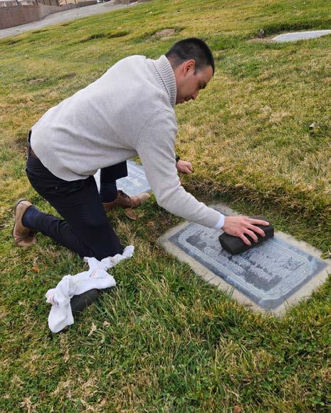 The gravestone looked to me like it needed to be replaced. But what do I know? "Not so fast. Wait right here," he told me, as he sped off to the supply shed. Returning with an ordinary black pumice stone, he started scrubbing. And lo and behold, the letters magically reappeared, looking like brand new in about fifteen