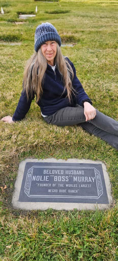 minutes. There it was! "BELOVED HUSBAND NOLIE 'BOSS' MURRAY." Next line: "FOUNDER OFTHE WORLD'S LARGEST NEGRO DUDE RANCH." On the left "1888," and on the right "1958." A feeling of great relief came over me. To think that right here, in the Bell Mountain area of Apple Valley, was once a welcoming oasis, with nice little cabins, horses, and a swimming reservoir, a dude ranch that welcomed people of all races back in the Jim Crow days, a Green Book site, a stopping place between Needles and Los Angeles for tired and hungry travelers trekking across the vast barren Mojave Desert. I am so thankful that Nolie Murray, a local celebrity in his own right, rests in peace right here under his once again shiny legible black granite grave marker.