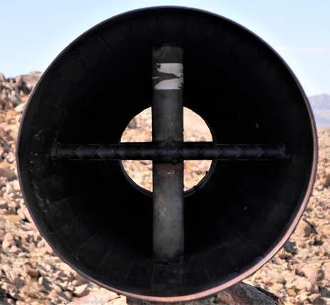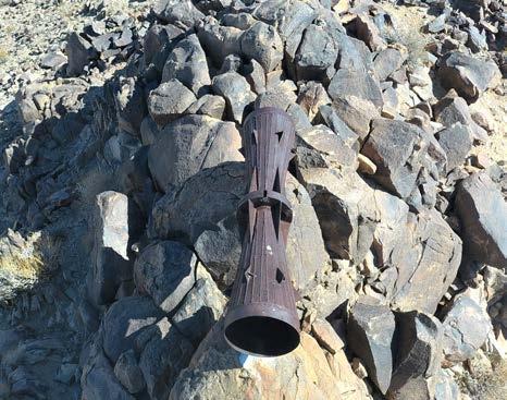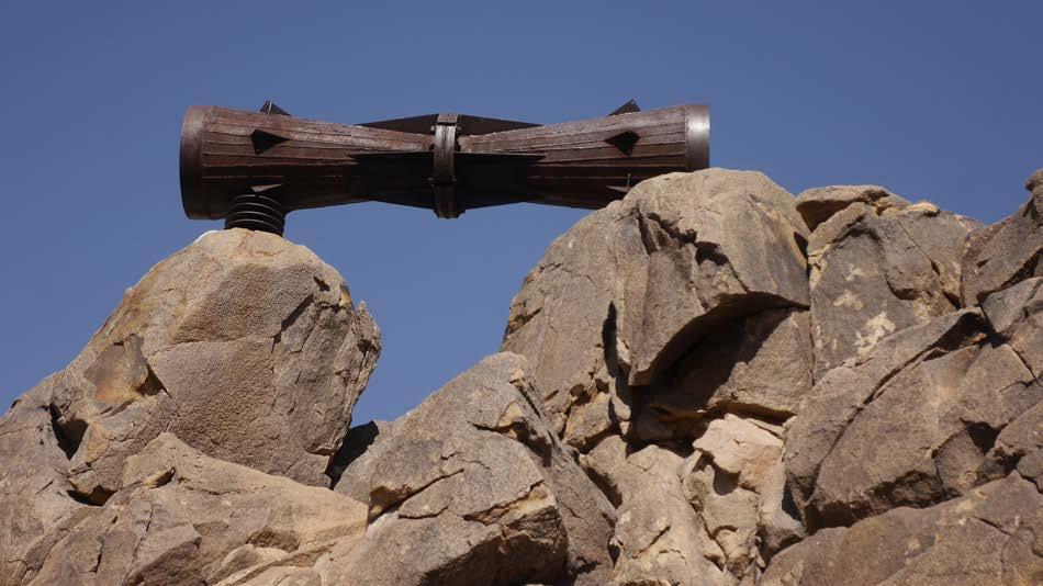 The megaphone is about eight feet long, weighs nearly six hundred pounds, and is hollow, narrow in the middle and wide at each end. The object is securely attached to two solid rocks with bolts drilled into those rocks.
