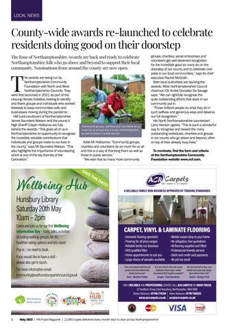 HM Lord-Lieutenant of Northamptonshire James Saunders Watson and the county’s High Sheriff Crispin Holborow are fully behind the awards. “This gives all of us in Northamptonshire an opportunity to recognise the incredibly valuable contributions that individuals and groups make to our lives in the county,” says Mr Saunders Watson. “This also highlights the importance of volunteering which is one of the key themes of the Coronation.”