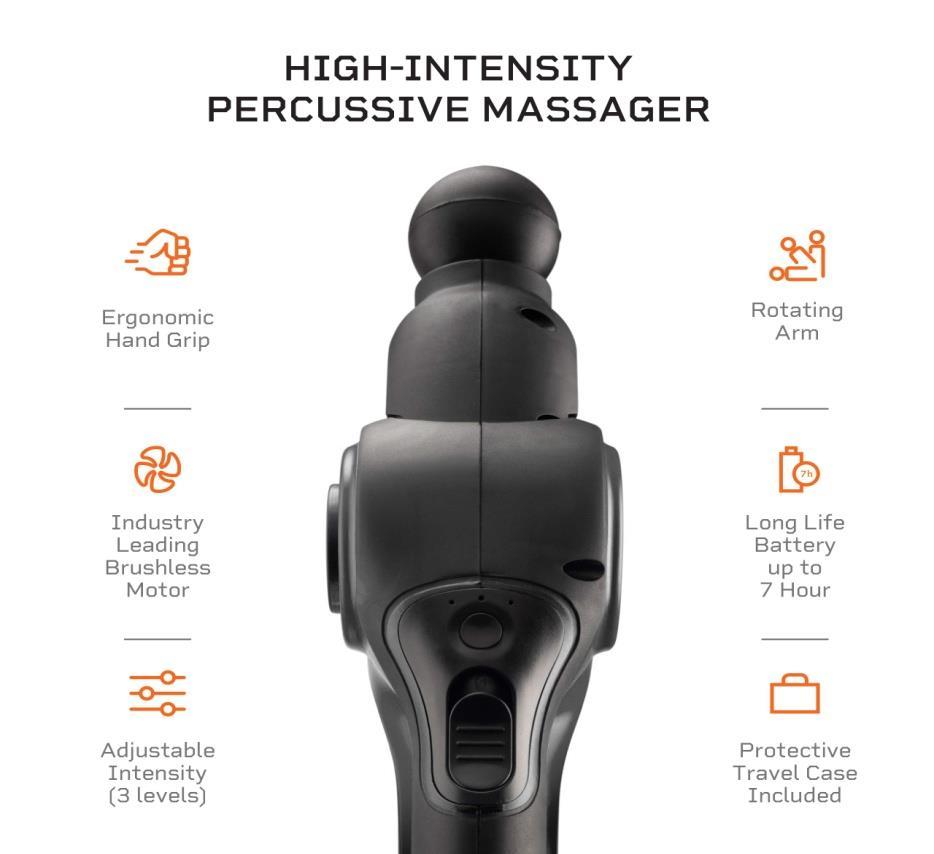 The PulseHero delivers deep-tissue massage with powerful percussive action, penetrating muscles to provide relief from soreness and tension. Its advanced motor provides up to 3200 percussions per minute for maximum therapeutic benefits.
