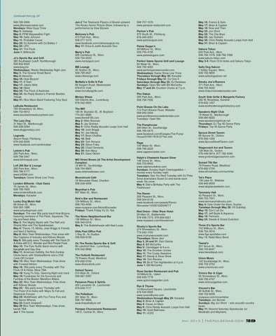 Continued from pg. 24 508-793-0900 www.jilliansworcester.com Mondays: Wise Guys Trivia May 3: Getaway May 4: PPW Mayweather Fight May 10: Salty Johnson May 11: Probable Cause May 24: DJ Karaoke with DJ Bobby J May 25: UFC May 31: The Flock June 1: Bittersuite JJ’s Sports Bar and Grill 380 Southwest Cutoff, Northborough 508-842-8420 www.jbag.biz Wednesdays: Wacky Wednesday Night Jam May 3: The Groove Street Band May 4: Aerochix May 10: How Bizarre! May 11: 9-Teen May 17: Jokers Wild May 18: Nibot May 24: The Flock of Assholes May 25: No Reply-Boston’s Premier Beatles Tribute May 31: Rico Moon Band Featuring Tony Soul LaScala Restaurant 183 Shrewsbury St, Worc. 508-753-9912 www.lascalashrewsburystreet.com The Lazy Dog 31 Main St., Marlborough 508-229-2264 www.doggonelazy.com Legends Airport Road, Fitchburg 978-342-6500 www.facebook.com/centericebar Leitrim’s Pub 265 Park Ave., Worc. 508-798-2447 www.leitrimspub.com Loft 266 Bar & Lounge 266 Park Ave., Worc. 508-796-5177 www.loft266.com Tuesdays: Game Show Live Trivia London Billiards / Club Oasis 70 James St., Worc. 508-799-7655 www.londonbilliards.com Mondays: Karaoke Lucky Dog Music Hall 89 Green St., Worc. 508-363-1888 www.luckydogmusic.com Sundays: The new ‘90s party band How Bizarre, featuring members of The Flock, Squeezer, The Vig and Neon Alley. May 3: The Mighty Mystic with The Raft and Shanty Man and The Speakeasies May 4: Theory 13, Minka, Josh Briggs & Friends and Next 2 Nothing May 8: Woo Town Wednesdays. Free show with Sky Captains of Industry and Killiney Woods May 9: ‘80s party every Thursday with The Flock Of A-Holes with D.C. Wonder and Rich People Food May 10: The Fear Nuttin Band returns with May 11: American Hellbilly, the Rob Zombie tribute band, with ShadowBomb and a Chili Cook-Off Contest May 15: Woo Town Wednesdays. Free show with Forward Motion May 16: ‘80s party every Thursday with The Flock Of A-Holes. More TBA May 18: Kung Fu Grip, Opening Night and more May 19: Fundraiser for the Survivors and Families of the Boston Marathon Attack. May 22: Woo Town Wednesdays. Free show with Killiney Woods May 23: ‘ 80s party every Thursday with The Flock Of A-Holes with Ways To Fall and Stephanie Forryan May 24: Mullethead, with Fox Force Five and The Genre Whores May 25 Clutch Grabwell May 29 Woo Town Wednesdays. Free show; bands TBA Jun 1 The Issues