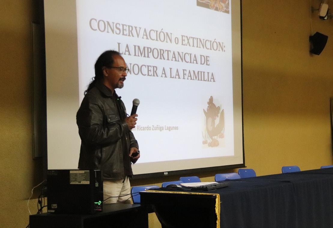 Tocó al profesor Sebastián Ricardo Zúñiga Lagunes empezar con el ciclo de ponencias. En su participación mostró con mapas e imágenes la distribución del ambystoma (ajolote) en el continente americano: 22 especies en USA y Canadá y 16 en México. Señaló que conocer su ubicación y genoma ha permitido ver sus semejanzas y diferencias. Por ello, subrayó la urgencia de ahondar más en los estudios genéticos de las otras 15 especies que se hallan en México, ya que hasta ahora sólo se conoce el mapa genómico del ambystoma mexicanum (ubicado en el centro del país y muy importante por su relación con la cultura prehispánica). Por otro lado, contrastó admitiendo que las especies fuera de México todas ya cuentan con su mapa genético.