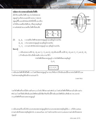 ข้ อควรรู้ 1. หม้อแปลงลง จะมีค่า E1 > E2 และ V1 > V2 และ N1 > N2หม้อแปลงขึ้น จะมีค่า E1 < E2 และ V1 < V2 และ N1 < N2 2. ถ้าหม้อแปลง มีประสิทธิภาพเต็ม 100% เราจะได้วา่ กาลังไฟฟ้ าที่ขดลวดปฐมภูมิ = กาลังไฟฟ้ าที่ขดลวดทุติยภูมิ P1= P2 I 1 V 1 = I2 V 2 6. หม้อแปลงไฟฟ้ าซึ่งใช้ไฟฟ้ า 110 โวลต์ มีขดลวดปฐมภูมิ 80 รอบ ถ้าต้องการให้หม้อแปลงนี้สามารถจ่ายไฟฟ้ าได้ 2200 โวลต์ ขดลวดทุติยภูมิตอ้ งมีจานวนรอบเท่าไร (1600 รอบ)