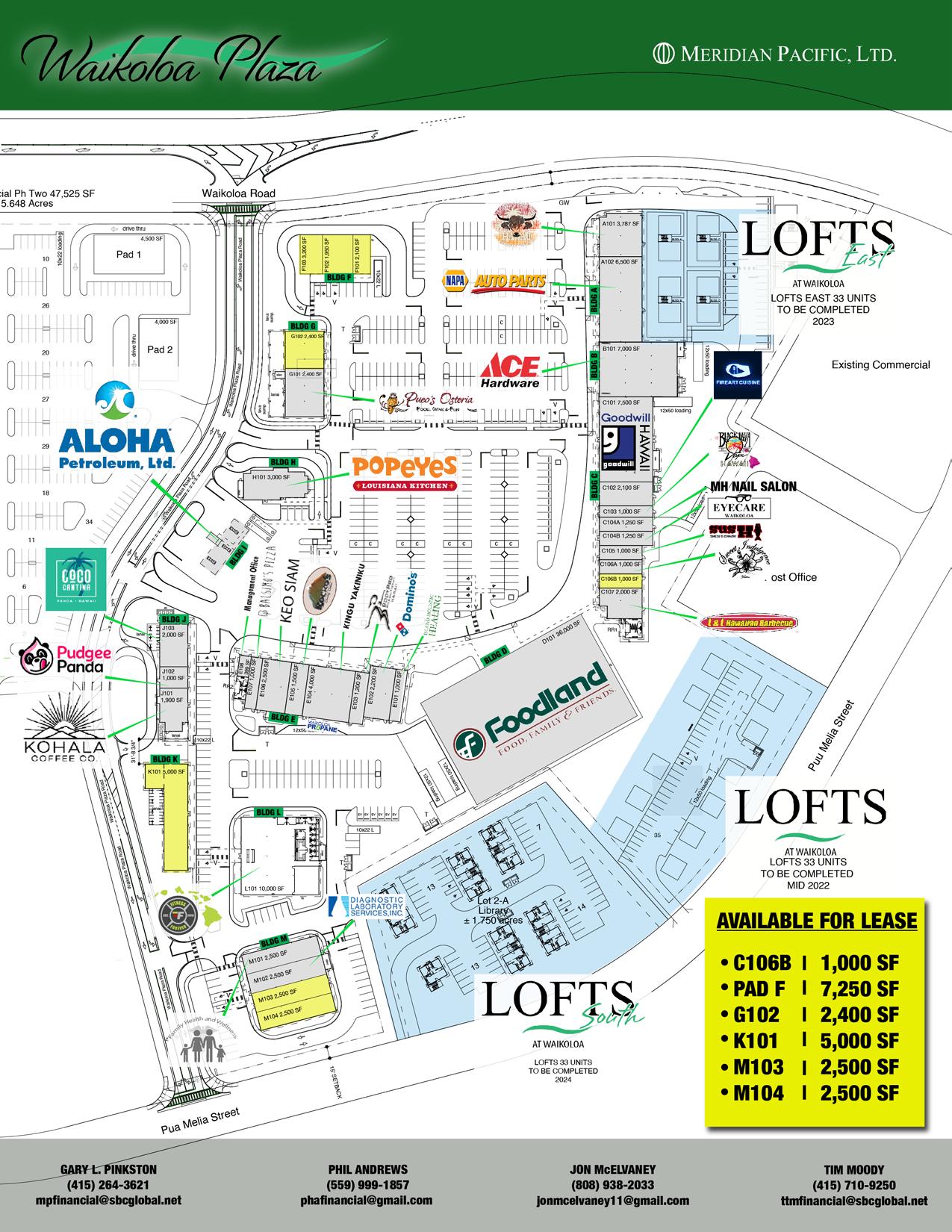 Building M ( Family Heath and Wellness & Diagnostic Laboratory Services) shell is complete. Family Health and Wellness plans are in design as well as Diagnostic Laboratory Services. A lease has been signed for M-103 for The Spa at Waikoloa. M-104 is available for lease.