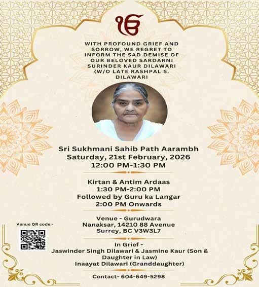The funeral will be held at the Fraser River Funeral Home, 2061 Riverside Road, Abbotsford, on Saturday, February 21, 2026, at 3 pm. A prayer service and community meal will follow at the Khalsa Diwan Society Gurdwara in Abbotsford. Anyone who wants to come to the funeral is most welcome.