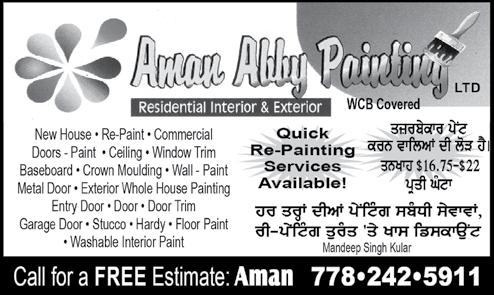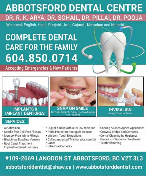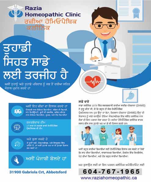 www.cvinsurance.ca Managing Par tner Managing Par tner 604.615.4950 rdhaliwal@insurebc.ca 778.552.8936 ggrewal@insurebc.ca # 160-32500 South Fraser Way | Abbotsford, BC | V2T 4W1(Beside FreshCo) HOME BUSINESS PROPERTY LIABILITY TRAVEL PRORATE LIFE/HEALTH Gagan Grewal Ravi Dhaliwal Get a Free Rate Comparison Today! 604 744 0999 Open 7 Days A Week Mon-Friday: 9:00 am-8:00 pm Saturday : 9:00 am-5:30 pm Sunday: 10:00 am-5:00 pm Central Valley Insurance Services Ltd. Fax: 604-744-0998 Looking For Insurance? WE’VE GOT YOU COVERED ryt dI qulnf muPq ivwc pRfpq kro! WE SPECIALIZE IN SUPER VISA INSURANCE G o v e r n m e n t C e r t i f i e d L a d y 4 , I n s t r u c t o r f o r C l a s s 5 & 7 sfz nfl tr k tr lr l n l x sb DI s prk kIqf jf skdf h . Since 2007 35 LIFECARE HOMEOPATHY UNIT OF NATURAL HOMEOPATHIC SOLUTIONS INC. SURREY LOCATION:231-8138 128ST.SURREY (2ND FLOOR PAYAL BUSINESS CENTRE) 604-502-9579 www.banihomeopathy.com 604-304-2236 FOR APPOINTMENTS CALL DR.SHVETA SAINI MBBS,MD,DHMHS(ONTARIO) PRACTICE SINCE LAST 10 YEARS ABBOTSFORD LOCATION :UNIT NO1-32056 CEDAR PARK (NEXT TO NATIONAL MORTGAGE OFFICE) ENTRY FROM SOUTH FRASERWAY SIDE anykF bImfrIafˆ dy shI ielfj leI hux sfzy koloˆ nvIˆ Koj nfl iqafr kIqIafˆ dvfeIafˆ lY skogy. * mfeIgRyn. * joVfˆ dy drd. * koeI vI aMdrUnI bImfrI. * iksy vI qrHfˆ dI ienPYkÈn. * gRihsqI