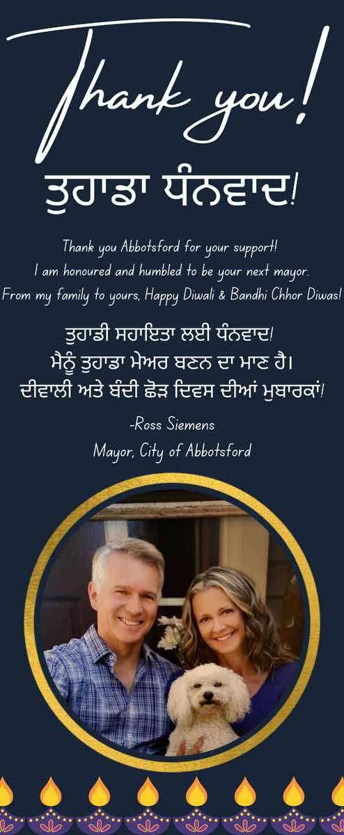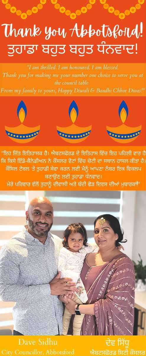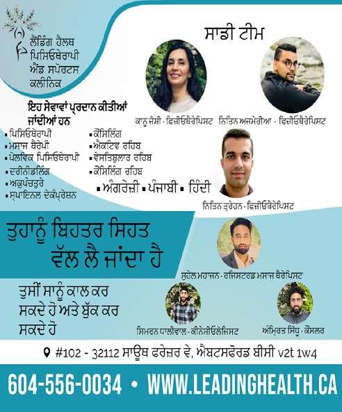 “ B R I D G I N G C O M M U N I T I E S ” 604.852.2288 | T h e P a t r i k a Weekly | Friday, October 21st, 2022 | Vol.27. No.05 | www.patrika.ca/e-newspaper | e:info@patrika.ca inrpwK, sqMqr aqy agFhvDU soc nMU prnfieaf hoieaf A SECULAR, INDEPENDENT & PROGRESSIVE NEWSPAPER asIN vYjI pIjLf bVy sfPL suQry ZMg nfl bxfAuNdy hF, ikAuNik asIN afp vI Pure Vegetarian hF. PIZZA JUNCTION Best Quality Pizza For Best Price 2M PIZZAS FOR $20 604-746-0246 Unit#6-32442, George Ferguson Way Abbotsford BC www.pizzajunctionsnacks.com 604-820-1112 3rd party billing (Blue Cross Sunli e, Manuli e, Standardlife & More) Proud to Serve Mission for Over 32 years! Junction Mall Unit 326,32555 London Ave, Mission (near Movie Theatre.) Satti Grewal swqI gryvfl 3rd pfrtI ibilMg bilAU krOs, snlfeIP, mYnUlfeIP, stYNzrz lfeIP aqy hor qkrIbn 32 sflF qoN imsLn dI syvf kridaF mfx mihsUs krdy hF! www swingoptical.com BOOK YOUR EYE EXAM TODAY WITH DR. BALISKY. DIRECT BILLING TO BLUE CROSS, SUNLIFE AND MANY MORE. afpxIaF awKF dI ingf leI awj hI zfktr nUM imlo qy cotI dIaF aYnkF lgfE qy afpxI idwK nUM hor vI sohxf bxfE. We Have All Types Of Brand Names: Office : 604 591 3590 Email: Info@jasjeetsidhu.ca one step closer to home sweet home...” Jasjeet Sidhu 778 536 9990 Mortgage Specialist LOOKING TO BUY OR SELL? Contact Akash Today! SCAN QR CODE www.mikegill.c21coastal.ca Experiences Agriculture 20+ Years Accounting & Finance 9+Years 604.615.4430 Mike Gill Real Estate VISITORS INSURANCE 111-2580 Cedar Park Pl, Abbotsford supr vIjLf Brinder Gill 604-835-1212 (Guaranteed Best Rates) 14 YEARS OF EXPERIENCE #100-2098 Carpenter St. #102-810 Clement Ave 2 LOCATIONS TO SERVE YOU ! tweIlW Aqy mwrbl Mon To Fri : 9:30 am To 5:30 pm Sevenoaks Shopping Centre 407-32900 South Fraser Way, Abbotsford PICK UP & DELIVERY Mon-Wed Thurs-Fri Sat Sun 10 am-6:30 pm 10 am-8:30 pm 10 am-6:30 pm 11 am-6:30 pm 604-746-4686 Any 8 CLASSIC SLICES from warmer $17.59 Pick up only NOW HIRING !! SHIFT SUPERVISOR LMIA AVAILABLE KAMMY KHAIRA YOUR REALTOR www.planetgrouprealty.com 604.866.7493 604.572.1008 #266-8128- 128th St., Surrey, BC V3W 1R1 Email: kammykhaira1@gmail.com contact: Houses/Farms/Apartments/condos sfiraF nUM dIvflI aqy bMdI CoV idvs dIaF bhuq bhuq vDfeIaF
