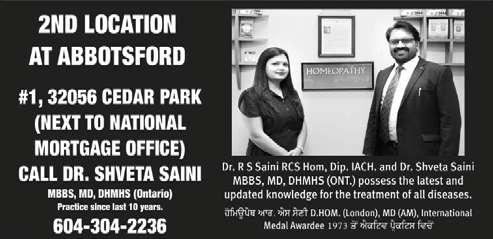 G o v e r n m e n t C e r t i f i e d L a d y 4 , I n s t r u c t o r f o r C l a s s 5 & 7 sfz nfl tr k tr lr l n l x sb DI s prk kIqf jf skdf h . Since 2007 35 LIFECARE HOMEOPATHY UNIT OF NATURAL HOMEOPATHIC SOLUTIONS INC. SURREY LOCATION:231-8138 128ST.SURREY (2ND FLOOR PAYAL BUSINESS CENTRE) 604-502-9579 www.banihomeopathy.com 604-304-2236 FOR APPOINTMENTS CALL DR.SHVETA SAINI MBBS,MD,DHMHS(ONTARIO) PRACTICE SINCE LAST 10 YEARS ABBOTSFORD LOCATION :UNIT NO1-32056 CEDAR PARK (NEXT TO NATIONAL MORTGAGE OFFICE) ENTRY FROM SOUTH FRASERWAY SIDE anykF bImfrIafˆ dy shI ielfj leI hux sfzy koloˆ nvIˆ Koj nfl iqafr kIqIafˆ dvfeIafˆ lY skogy. * mfeIgRyn. * joVfˆ dy drd. * koeI vI aMdrUnI bImfrI. * iksy vI qrHfˆ dI ienPYkÈn. * gRihsqI jIvn sbMDI smwisafvfˆ. * AudfsI aqy Gbrfht rog. * cmVI dy rog. * ikwl muhfsy, iÌnsIafˆ afid. * Qfierfz. ALL MAJOR COMPANIES INSURANCES COVERED asIN sfrIaF ieMnsoLrYNs kMpnIaF nUM vI kvr krdy hF.
