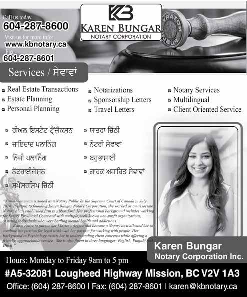For all your Accounting and Business Advisory needs please call ÚÅðàâ pRoPYsLnl ÁÕÅÀ±ºà˺à å¶ Çì÷éà aYzvfeIjLr • Bookkeeping • Notice to Readers • Preparation of Personal & Corporate Taxes • Assurance Engagements (Review Engagements) • General Business Planning • Tax Planning • Assistance with C R A Audits Serving the Fraser Valley and Lower Mainland First Consultation is F R E E pihlI sl`h muPq You can also visit us at www.parmarca.ca Parminder has worked for one of the top 10 Canadian accounting firms, use his experience to grow your business. êðÇî§çð ÕËé¶âÅ çÆÁÅ À°µÚ Õ¯àÆ çÆÁÅ A@ ÁÕÅÀ°ºÇà§× Õ§êéÆÁÅ ÇòµÚ¯º ÇÂµÕ ÇòµÚ Õ§î Õð Ú°µÕÅ ÔË¢ ÁÅêä¶ ÇìÜÇéà ÇòµÚ òÅèÅ Õðé ñÂÆ À°Ãç¶ å÷ðì¶ å¯º ñÅí ñò¯¢ We are hiring! We are looking for an experienced bookkeeper, please email resume to Parminder.parmar@parmarca.ca Parm Parmar, CPA, CA Assurance and Tax Services Tel: 604.852.5758 Fax: 604.852.4022 Email: parminder.parmar@parmarca.ca 210-32525 Simon Ave Abbotsford, BC V2T 6T6 www.parmarca.ca 205-2580 Cedar Park, Abbotsford, BC V2T 3S5 shfrf lfa kfrporysLn SAHARA LAW CORPORATION BARRISTER SOLICITOR & NOTARY PUBLIC saharalawcorp@gmail.com (778)-347-7525 Areas of Practice Family Law Immigration Law Criminal Law Real Estate Law Notary Services (Provide all kinds of Notary Services) FREE CONSULTATION 20 YEARS OF EXPERIENCE AS A LAWYER IN INDIA Also, member of Punjab & Haryana High Court Bar Association and Free consultation About your litigation matters in India. srivss PYmlI lfa iemIgRysLn lfa ikRmInl lfa rIal astyt lfa notrI syvfvF (hr qrF dIaF notrI syvfvF AuplbD hn) Gurmeet Singh Chaina Mon-Sat 9am - 5pm