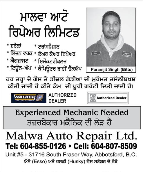 . . 604 852 6276 2112 TOWNLINE ROAD ABB OTSFORD | Sat Sharma New/used cars Tune Up Brakes Exhaust Front End Work Engine Repairs Clutches Water Pumps Trany Ser vice U-Joints Front Axle Tires Shafts Ect. Providing over 20 years of Professional Automotive Repair exper tience right here in Abbotsfor t! Don’t Despair Sat will be there. We do ALL this and even More! E`p dI k`r j~ ip@kE@p dI hryk qrH~ dI mkYnIkl sm@isE` d` h@l qs@lIbKS kMm r`hIN kIq` j~d` hY! itAUn aWp, brykF, aYgjLfst, PrMt aYWz vrk, ieMjn irpyarjL, klWc, vftr pMp, trYnI srivs, XU- jfieMtjL, PrMt aYksl sLfPtjL afid E`to irpyEr ilimtf ey.tI. I. O P E N: | C LO S E D: Tuesday to S a turday Sunday and Monday Repair Shop Looking for a 3rd or 4th year Mechanic! “We also do vehicle air condition servicing” BYLAW ENFORCEMENT OFFICER 1 BYLAW ENFORCEMENT OFFICER 2 (2 week) Distance Education Friday, March 3rd, 2023 PAGE 32 The Patrika PAGE 32