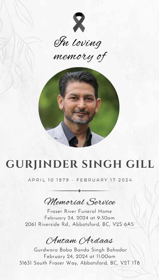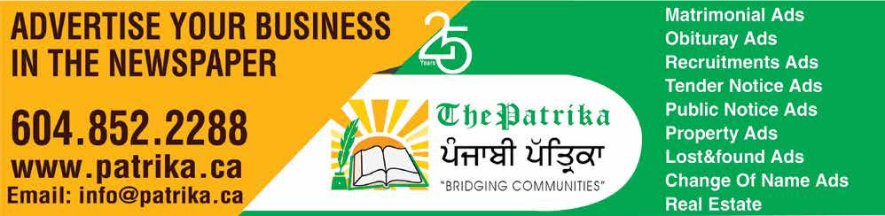 “ B R I D G I N G C O M M U N I T I E S ” 604.852.2288 | T h e P a t r i k a Weekly | Friday, February 23rd, 2024 | Vol.28. No.23 | www.patrika.ca/e-newspaper | e:info@patrika.ca inrpwK, sqMqr aqy agFhvDU soc nMU prnfieaf hoieaf A SECULAR, INDEPENDENT & PROGRESSIVE NEWSPAPER Abbotsford, BC - (Head Office) Phone: 604-746-4888 Fax 604-746-4999 Hours of Operation : Mon-Fri: 9:00am - 8:00pm Weekends & Holidays: 10:00am - 6:00pm www.insurelinelighthouse.com #101 - 30485 Blueridge Drive, Abbotsford B.C., V2T 0B1 Home Insurance Super Visa Insurance Travel Insurance Commercial Insurance Townhome/Condo Insurance Construction Insurance Fleet Insurance Cargo Insurance Pro Rate Insurance Farm Insurance Gr dI ieMnsLorYNs supr vIjLf ieMnsLorYNs tRYvl ieMnsLorYNs kmrsLIal ieMnsLorYNs tfAUn hfAUs/ kONzo dI ieMnsLorYNs knstRwksLn dI ieMnsLorYNs PlIt ieMnsLorYNs kfrgo ieMnsLorYNs pRo ryt ieMnsLorYNs Pfrm dI ieMnsLorYNs HOME INSURANCE DISCOUNT CARGO PRO-RATE FLEET BC’s Only Bilingual Newspaper Since 1996. 1996 qoN Cpx vflf ibRitsL kolMbIaf df pihlf do-BfsLIaf aKLbfr PAR PABLA 778-823-2278 Real Estate Representative real.parpabla@gmail.com Contact Par today! Specializing in Residential and Agricultural Properties BUYING OR SELLING ? T H A NK YOUFORSUPPORTING YOUR PHARMASAVEWESTR DGE T E A M Now Open in your neighbourhood Westridge Pharmasave Mom to Fri: 9:00am-6:00pm Saturday: 10:00 am-2:00pm | Sunday: Closed Blister Packaging Free Delivery Blood Pressure Monitoring Diabetes Education OPEN 6 DAYS A WEEK hPqy ivwc 6 idn Kuly hn Phone: 604.776.3111 Fax : 604.776.3110 #105-3670 Townline Rd. Abbotsford, BC. Pharmacist can now prescribe for common ailments Pfrmfisst hux quhfnUM dvfeIaF pRskrfeIb kr skdy hn bilstr pYkfijMg muPLq ivwc zilvrI blwz prYsLr monItr sLUgr dI ibmfrI bfry jfxkfrI vYstirwj Pfrmfsyv aMgryjI, pMjfbI, ihMdI ivwc dvfeIaF dI jfxkfrI Westridge Pharmasave L e a r n m o r e a t w w w . a b b o t s f o r d . t e c h .
