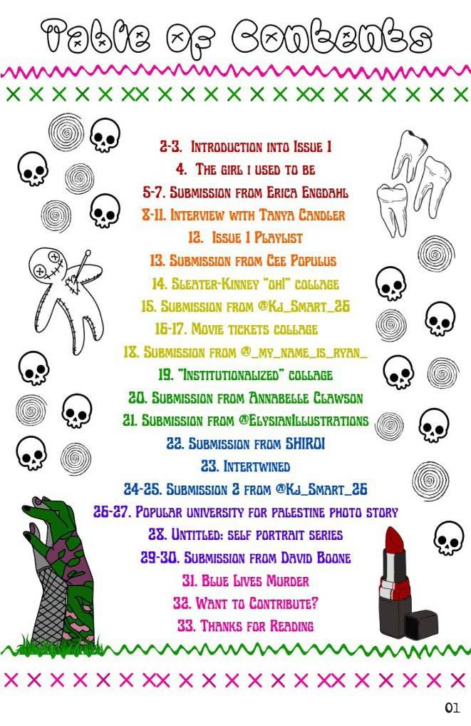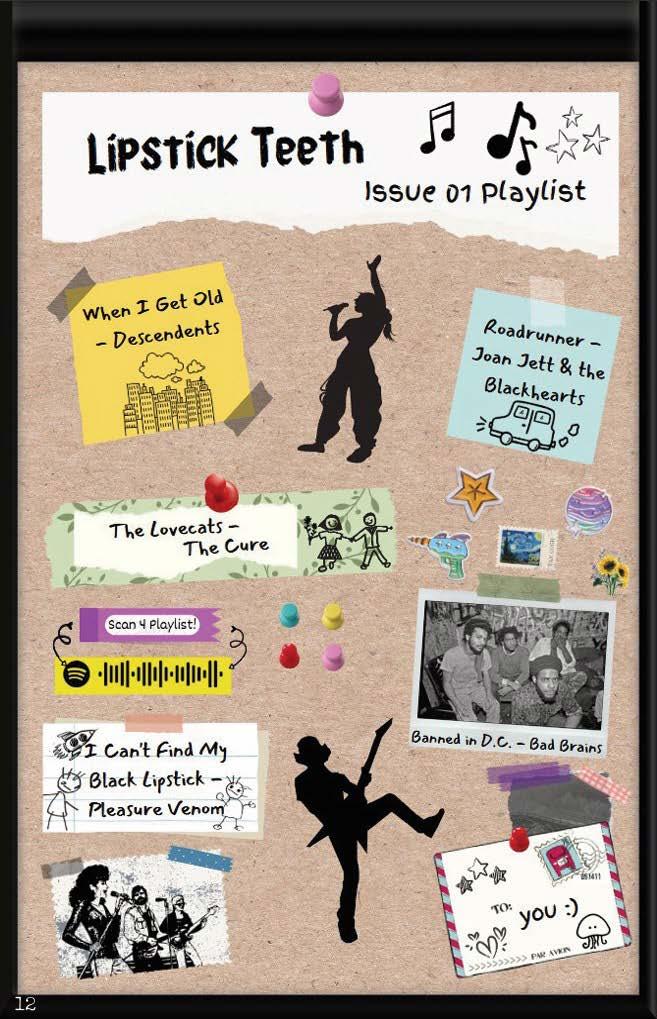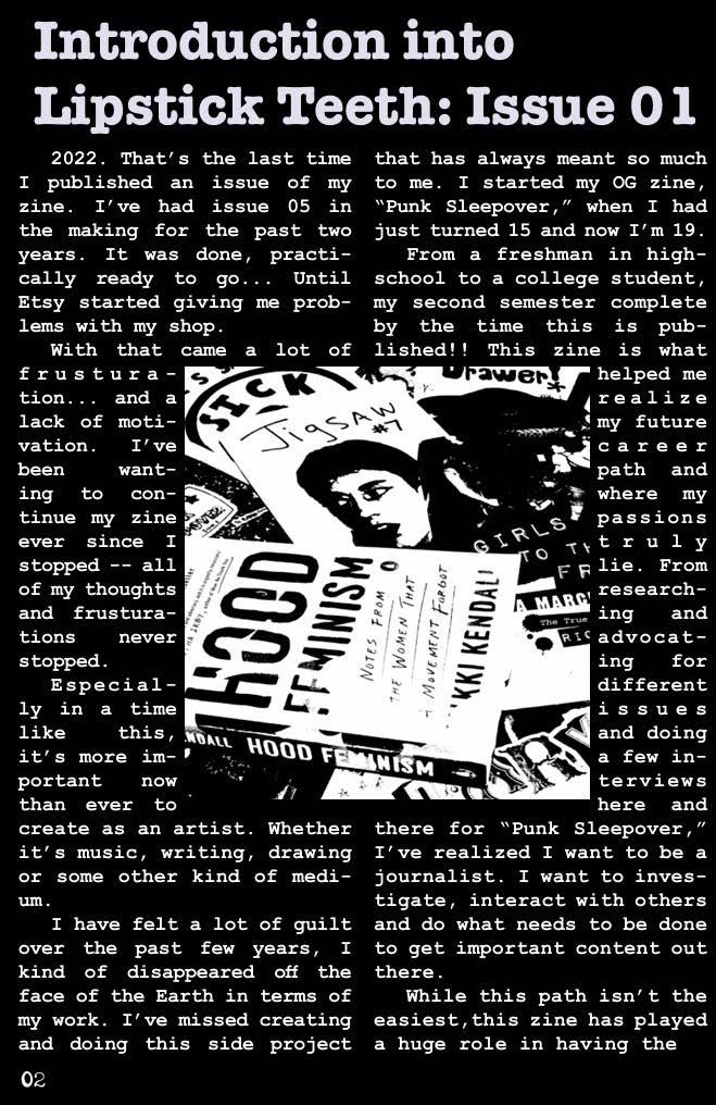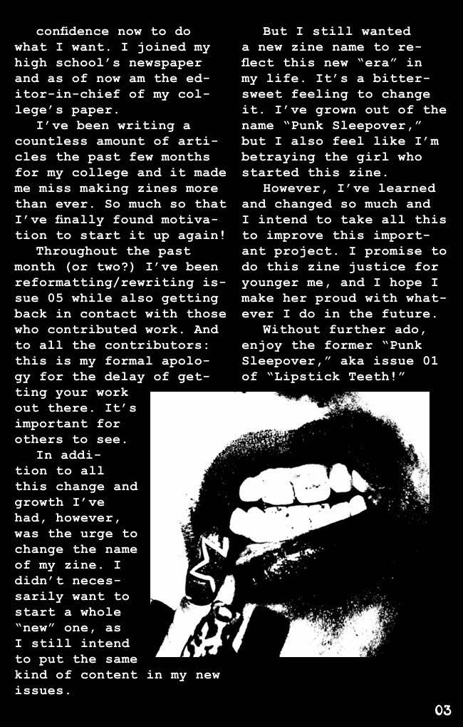 Issue 1 of my zine "Lipstick Teeth." It's 33 pages full of various art/writing from eight contributors, along with an interview from OG KITTIE bassist Tanya Candler.