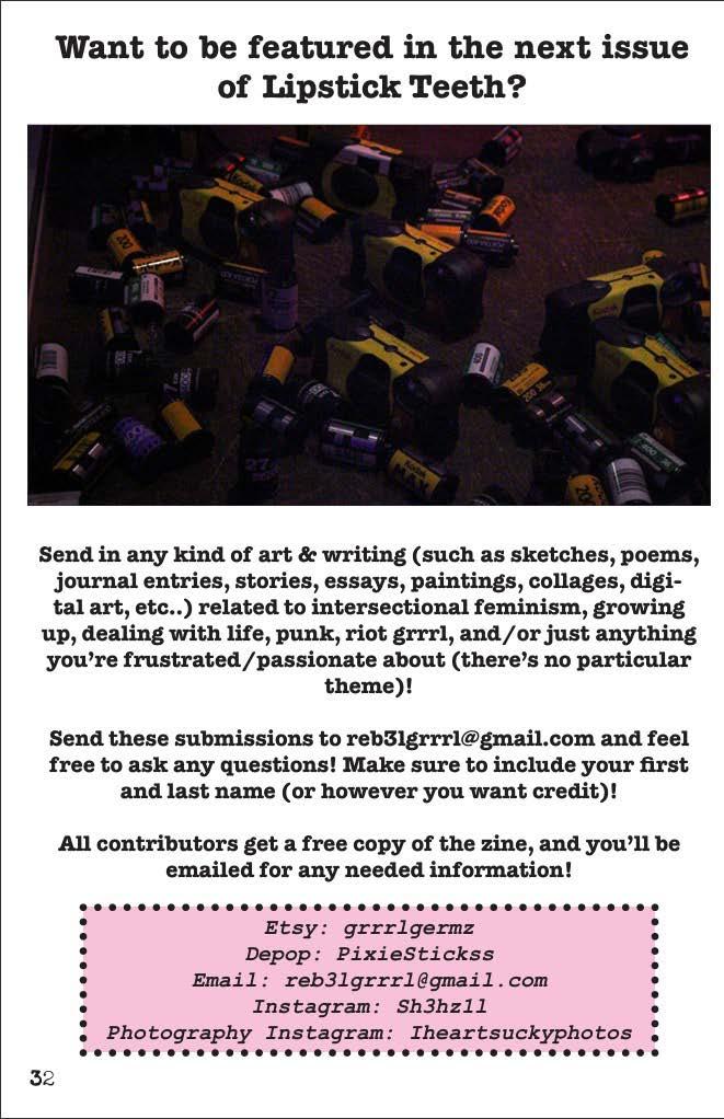 Want to contribute to issue 2 of Lipstick Teeth? Email any type of work to reb3lgrrrl@gmail.com or dm me on Instagram (Sh3hz1l)!