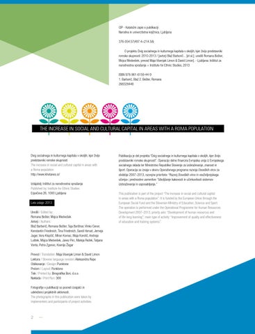 CIP - Kataložni zapis o publikaciji Narodna in univerzitetna knjižnica, Ljubljana 376-054.57(497.4=214.58) O projektu Dvig socialnega in kulturnega kapitala v okoljih, kjer živijo predstavniki romske skupnosti: 2010-2013 / [avtorji Blaž Barborič... [et al.]; uredili Romana Bešter, Mojca Medvešek; prevod Maja Visenjak Limon & David Limon]. - Ljubljana: Inštitut za narodnostna vprašanja = Institute for Ethnic Studies, 2013 ISBN 978-961-6159-44-9 1. Barborič, Blaž 2. Bešter, Romana 268328448